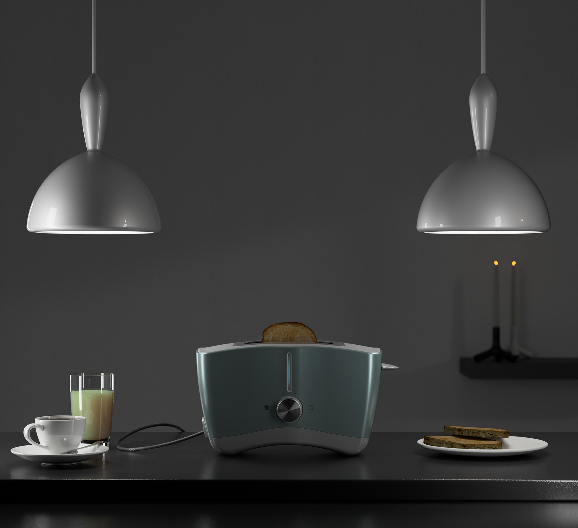 Royalty free licence model from Turbosquid (kitchen) was imported into Fusion 360 and used as a full scene alongside the rebuilt toaster concept. (Textures applied to main body to give a low spark finish.)